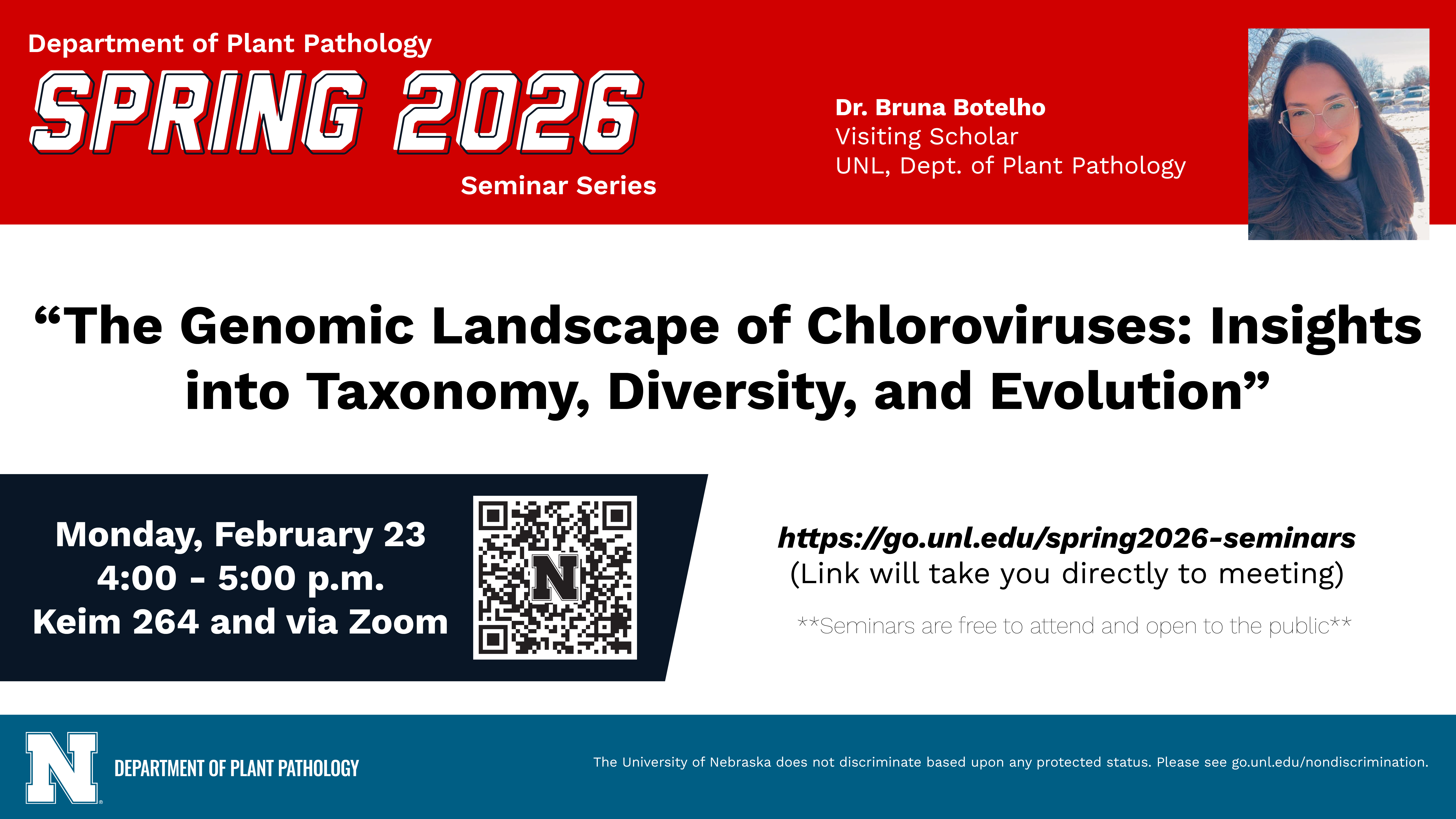 Please join us next Monday as we bring you the next presentation in the Plant Pathology Spring 2026 seminar series! Dr. Bruna Botelho, visiting scholar in the Van Etten lab in the Department of Plant Pathology, will be presenting “The Genomic Landscape of Chloroviruses: Insights into Taxonomy, Diversity, and Evolution”. We will meet Monday, February 23 in-person in Keim 264 and online via Zoom.