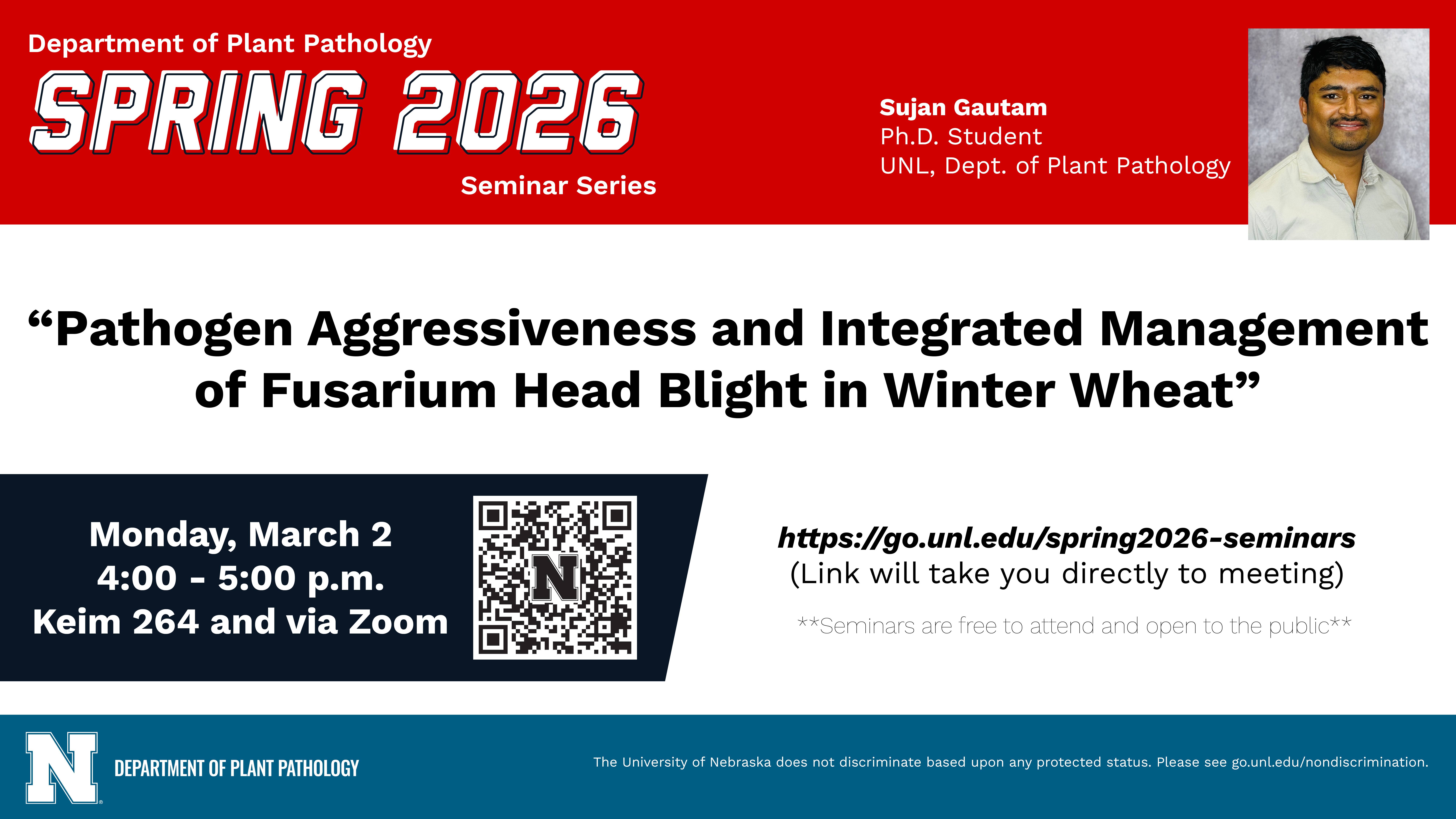 Please join us later today as we bring you the next presentation in the Plant Pathology Spring 2026 seminar series! Sujan Gautam, PhD student in the Department of Plant Pathology, will be presenting "Pathogen Aggressiveness and Integrated Management of Fusarium Head Blight in Winter Wheat". We will meet this afternoon at 4pm in-person in Keim 264 and online via Zoom.